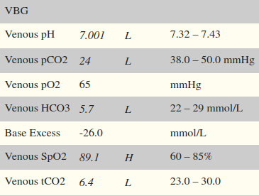 Before you start infusing saline, your senior warns you to check the corrected sodium rather than the sodium in reports. You check the corrected sodium and it comes out to be higher than 135 mmole/l which warrants for administration of 0.45% saline. You start it at 250 to 500 ml/hr. Meanwhile, VBG reports arrive.